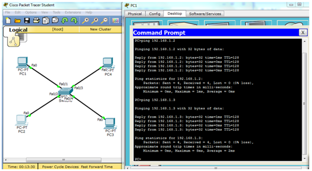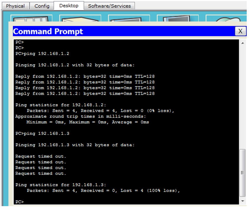 Sau khi gán xong thì kết quả là PC1 và PC2 nối vào 2 port Switch chung vlan 10 nên ping sẽ thông nhau, còn PC3 và PC4 thuộc vlan 1 và vlan 20 nên không thể ping đến nhau và đến PC1 và PC2 trên vlan 10. Nếu muốn PC3 và PC4 ping thông thì bạn lại gán PC4 vào vlan 20.