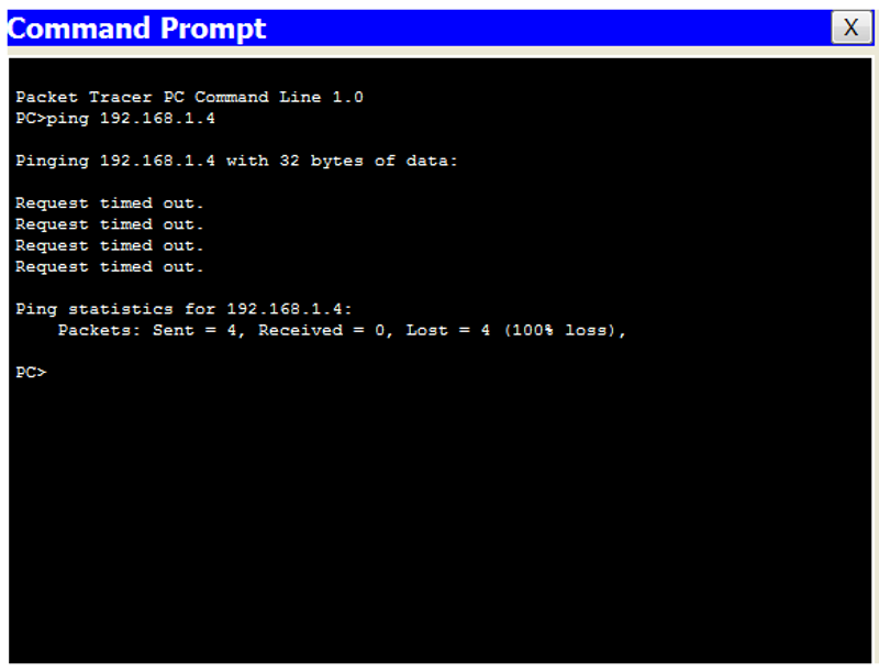 Ping từ PC3 thuộc vlan 20 đến PC4 thuộc vlan 1 cũng thất bại